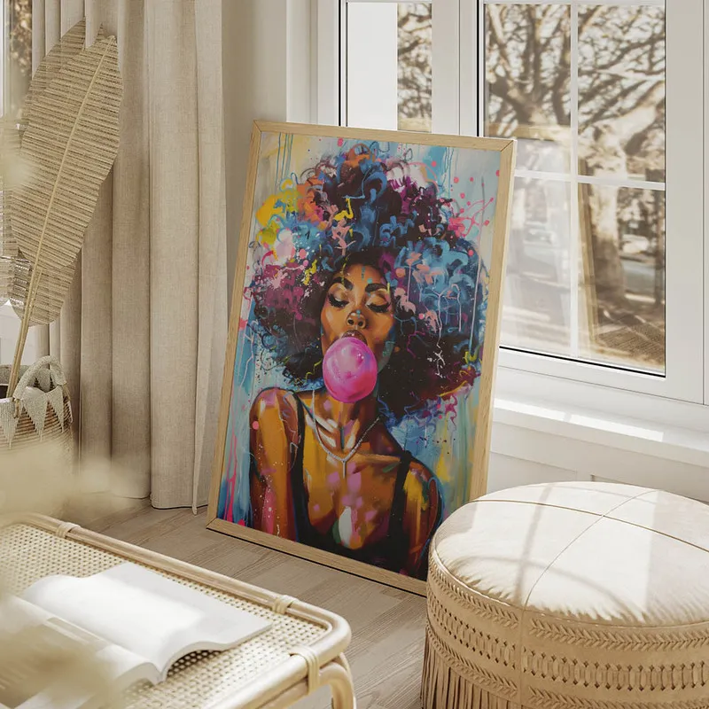 On a vraiment eu un coup de cœur pour le Poster femme afro colorée chewing-gum. En le regardant, ça met tout de suite de bonne humeur ! Cette femme avec sa coiffure afro stylée et son chewing-gum, c'est comme une petite bulle de joie qui éclate dans notre déco. On adore ce mélange de couleurs vives, ça donne un côté super dynamique à n'importe quelle pièce.