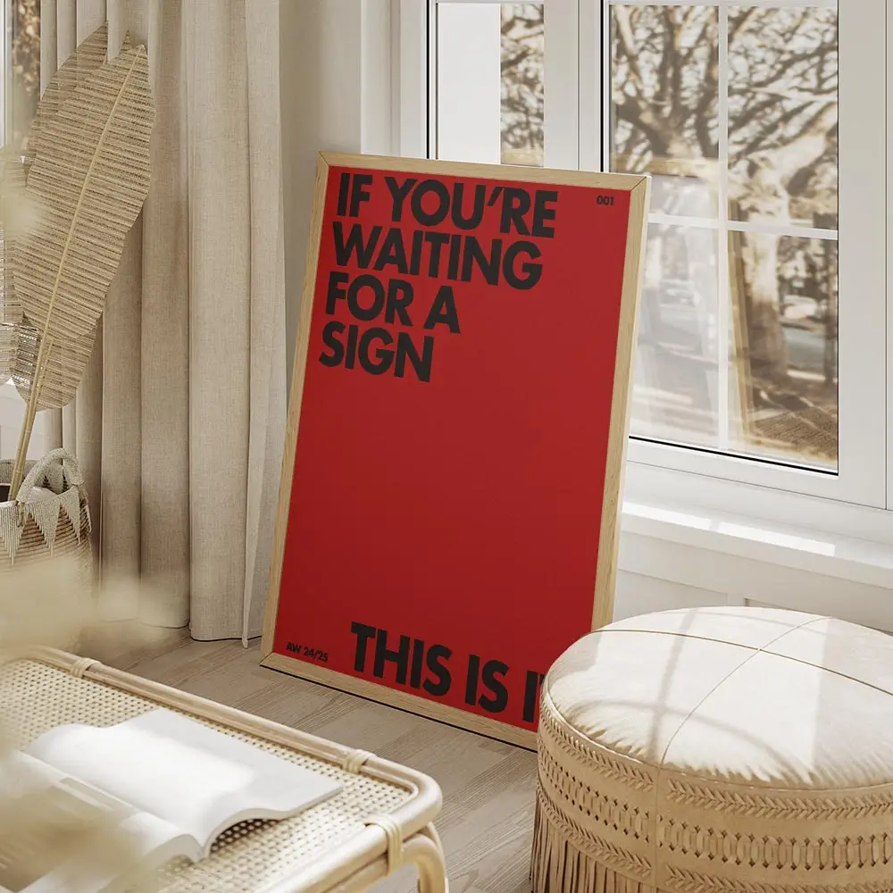 Ce Affiche citation rouge This is it capte l’œil avec une couleur rouge franc et un message direct en anglais. On voit une surface rouge unie, un texte noir en plein centre, et une mise en page très nette, presque minimale. La phrase visible est If you're waiting for a sign this is it, claire et sans fioriture.