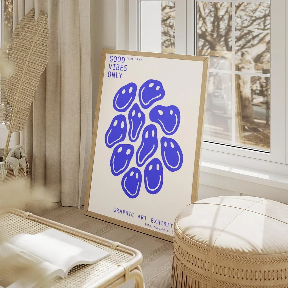 Ce Affiche smileys bleus texte good vibes only joue la carte du sourire sans chichi. On voit des smileys bleus volontairement déformés, aux formes rondes étirées, qui se répètent sur un fond clair. Le texte bleu "GOOD VIBES ONLY" s'impose dans la composition, lisible et net. Les nuances de bleu varient légèrement, du bleu ciel au bleu plus soutenu, et les contours restent simples, graphiques et spontanés.