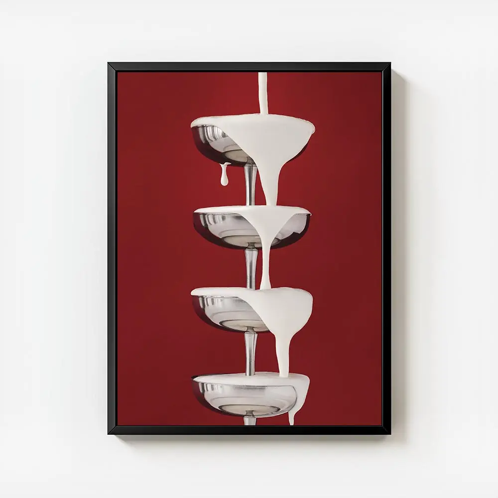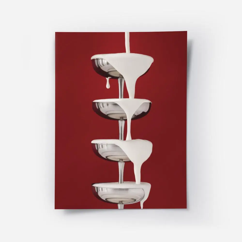 On découvre Affiche cascade de crème sur coupes, un visuel qui capte le regard. On voit une cascade de crème blanche versée en filet, des gouttes qui rebondissent et des cuvettes de verre aux reflets argentés. L'ambiance reste épurée, lumineuse, très photo. La lumière souligne la texture et crée des reflets nets sur le métal.