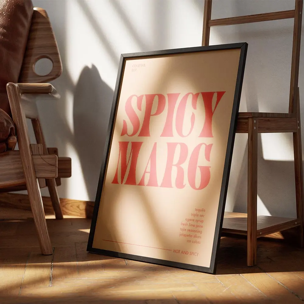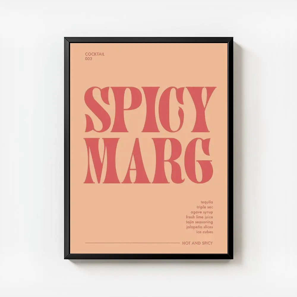 Cette Affiche cocktail margarita épicée montre un verre de margarita en gros plan, lumineux et net. On remarque tout de suite le texte en typographie orange et rouge qui traverse l’image. Les tons chauds apportent de l’énergie, une sensation épicée et solaire qui saute aux yeux. Le graphisme joue sur la typographie, simple et impactante.