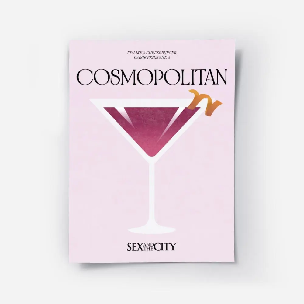 Ce Affiche Cosmopolitan rose montre un verre à cocktail posé au centre, un liquide rosé qui capte la lumière et une écorce d'orange enroulée sur le bord. Le fond rose clair crée une atmosphère douce, presque sucrée. On voit le pied fin du verre et un léger reflet sur la surface, ça attire le regard.