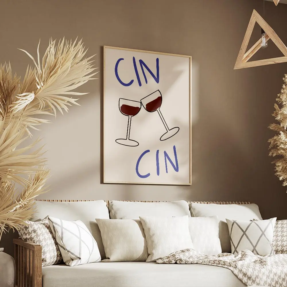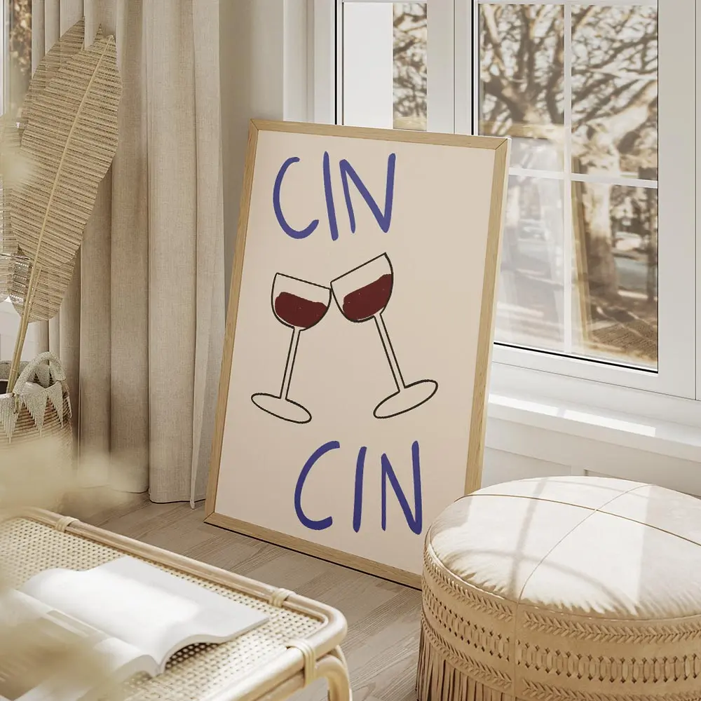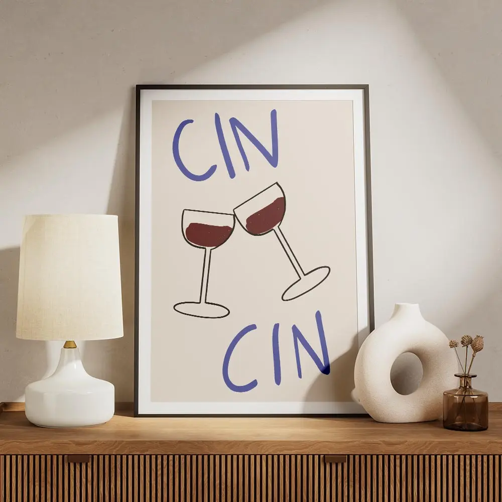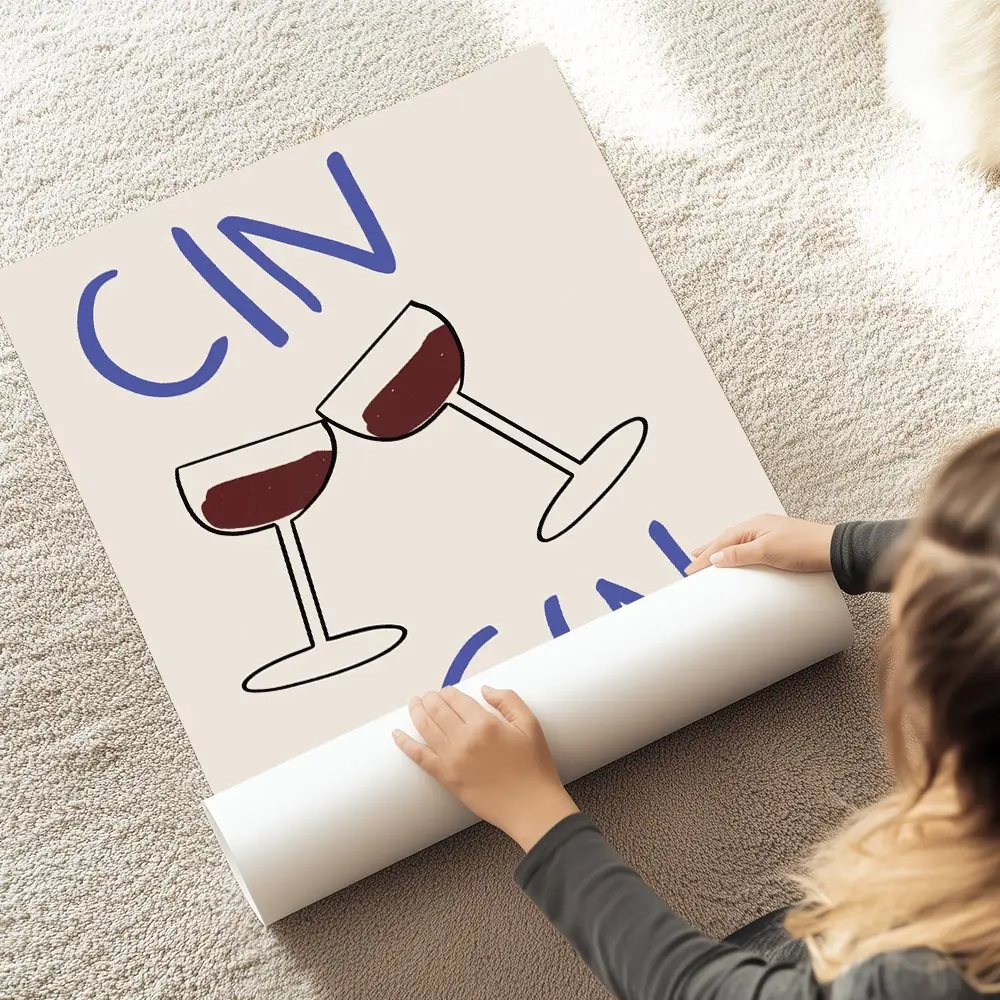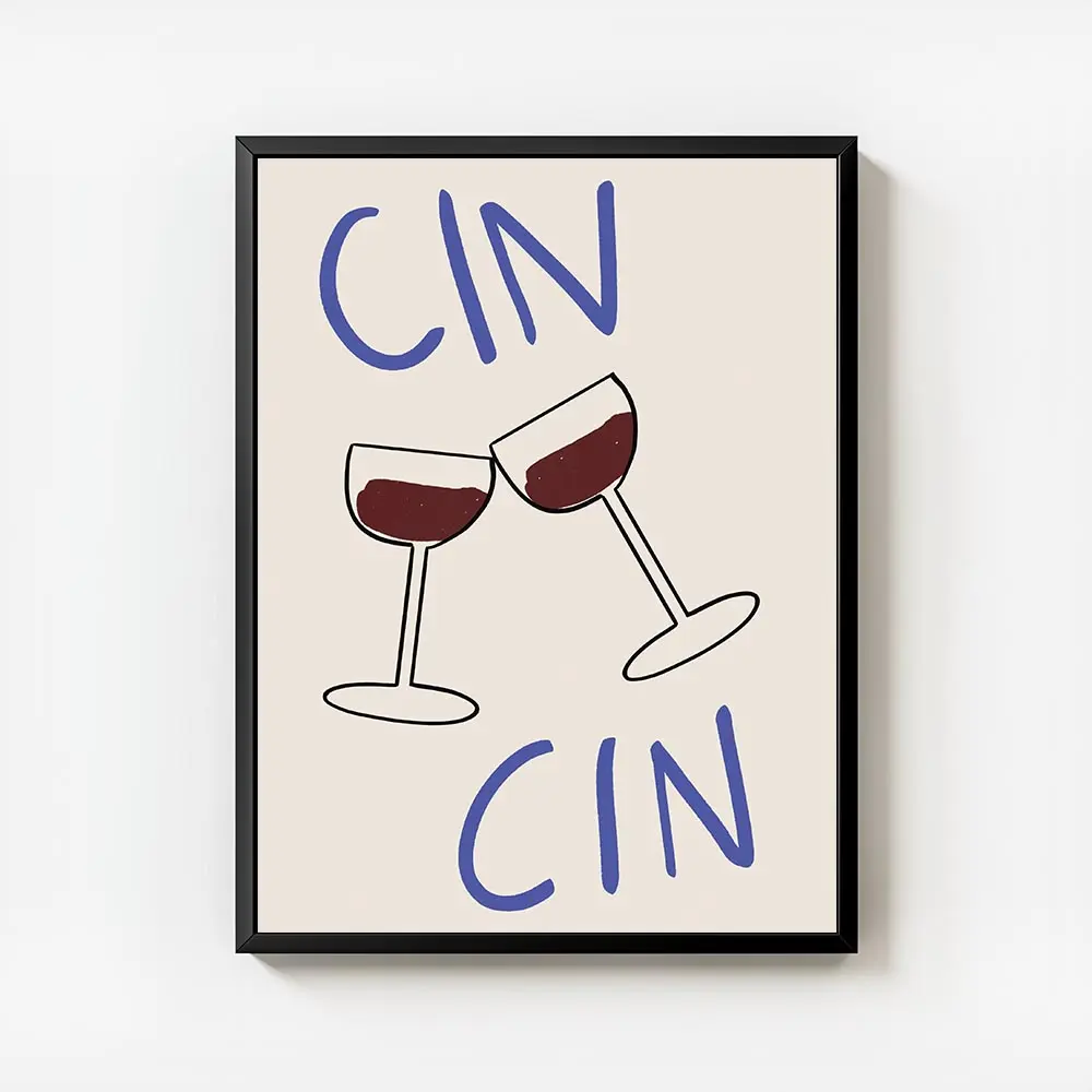 Ce Affiche deux verres de vin cin cin capture l’instant du toast: deux verres qui se rencontrent, vin rouge profond, et le mot "cin cin" en typographie posée. Le fond reste lumineux et simple, pour laisser le geste parler. On ressent la convivialité, la chaleur d’un petit moment partagé, vraiment simple et direct.