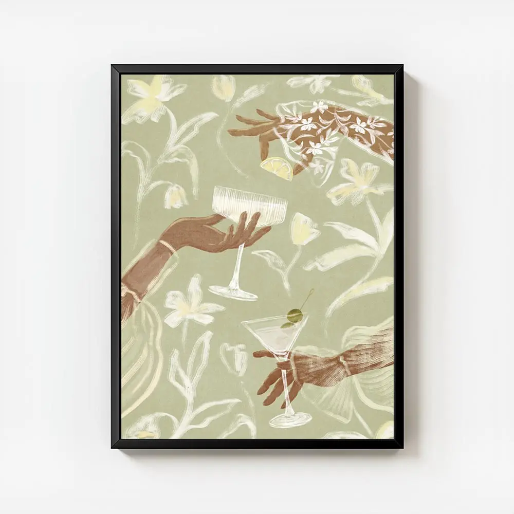Ce Affiche mains et verres à cocktail lys montre des mains qui tiennent des verres à cocktail, entourées de lys. Le rendu reste clairement illustratif, lignes nettes et formes épurées. On voit les doigts posés contre les verres, les pétales de lys qui encadrent la scène, et le contraste entre le sujet et le fond.
