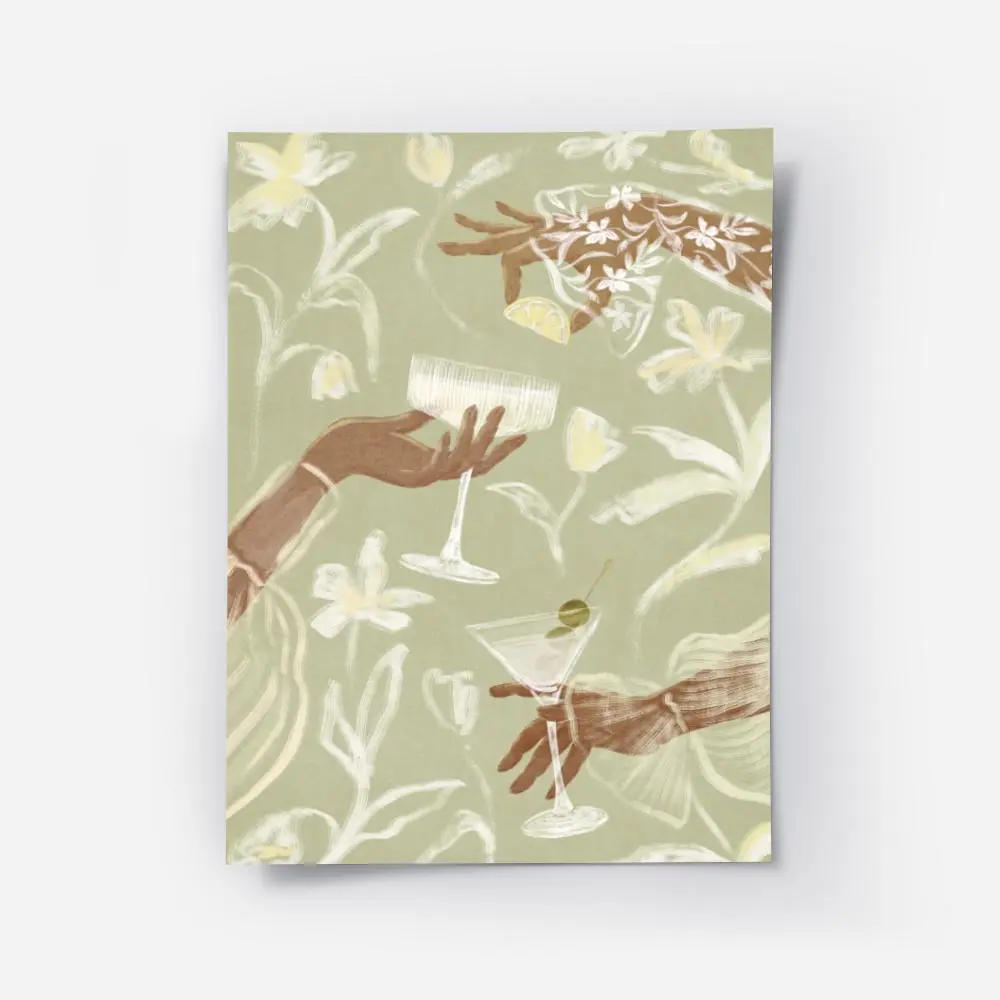 On repère plusieurs éléments précis: les mains en gros plan, les verres à cocktail visibles en train de trinquer, les fleurs de lys avec leurs longues pétales, et un traitement graphique minimaliste qui laisse respirer la composition. L’ambiance paraît calme, chic, presque délicate, sans surcharge. La palette semble douce, on dirait plutôt des tons sobres et raffinés.