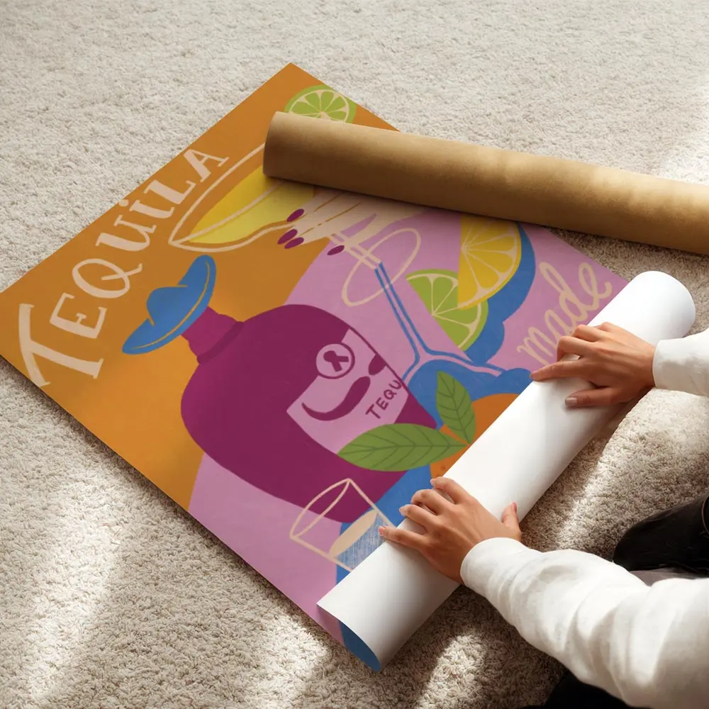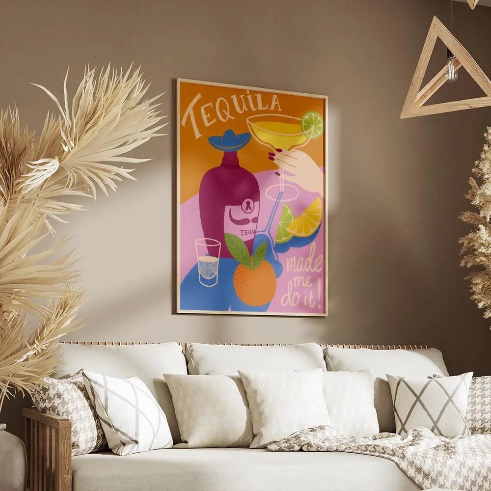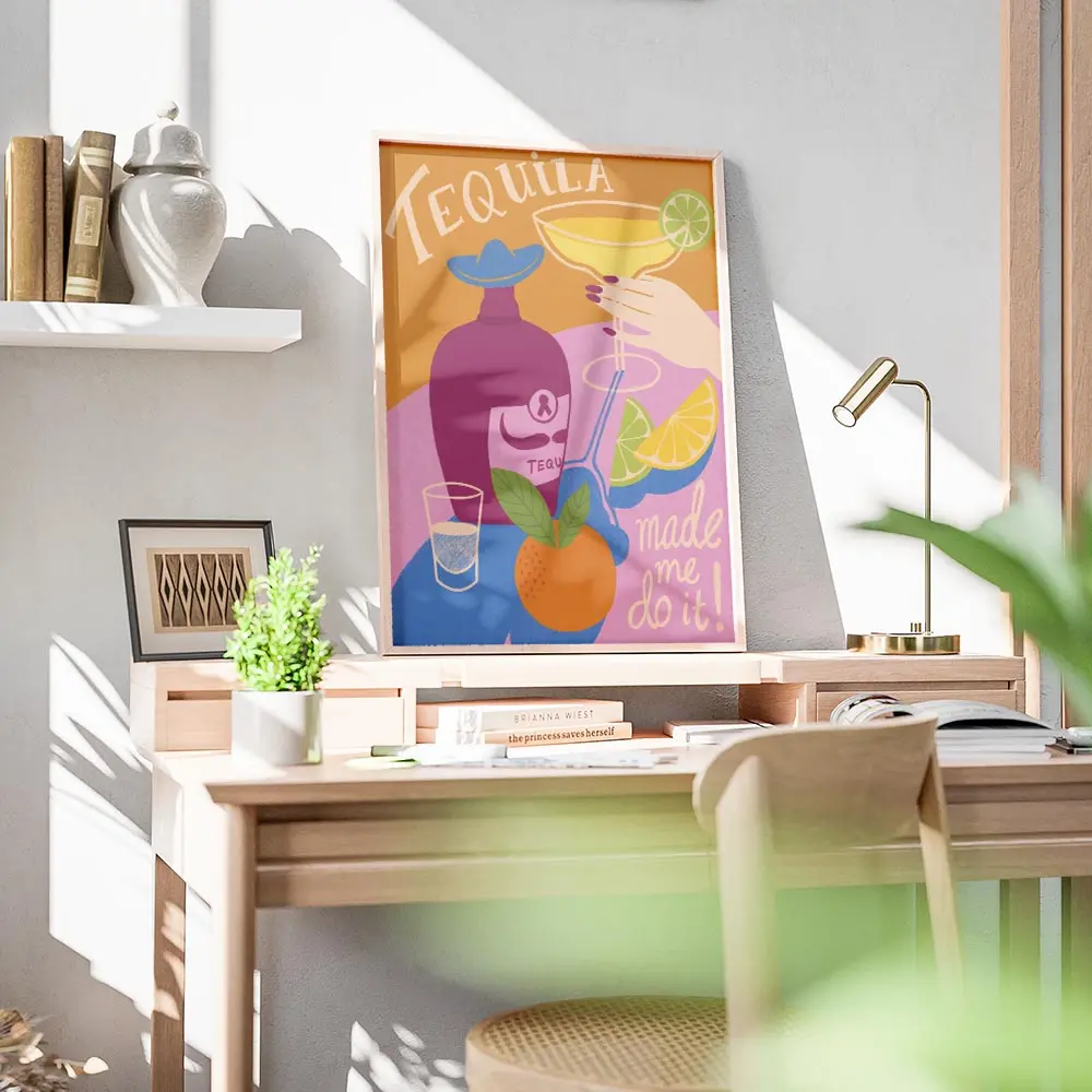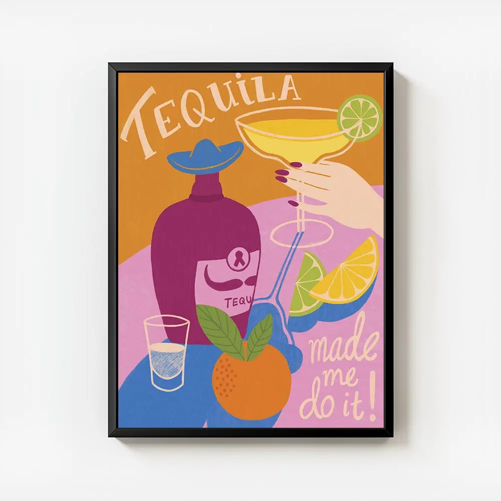 Ce Affiche tequila bouteille capte tout de suite l’œil. On voit une bouteille en verre, un verre à margarita posé à côté et des tranches d'agrumes. Le rendu est lumineux, très coloré. Les teintes chaudes et vives donnent envie de soirée, de convivialité.
